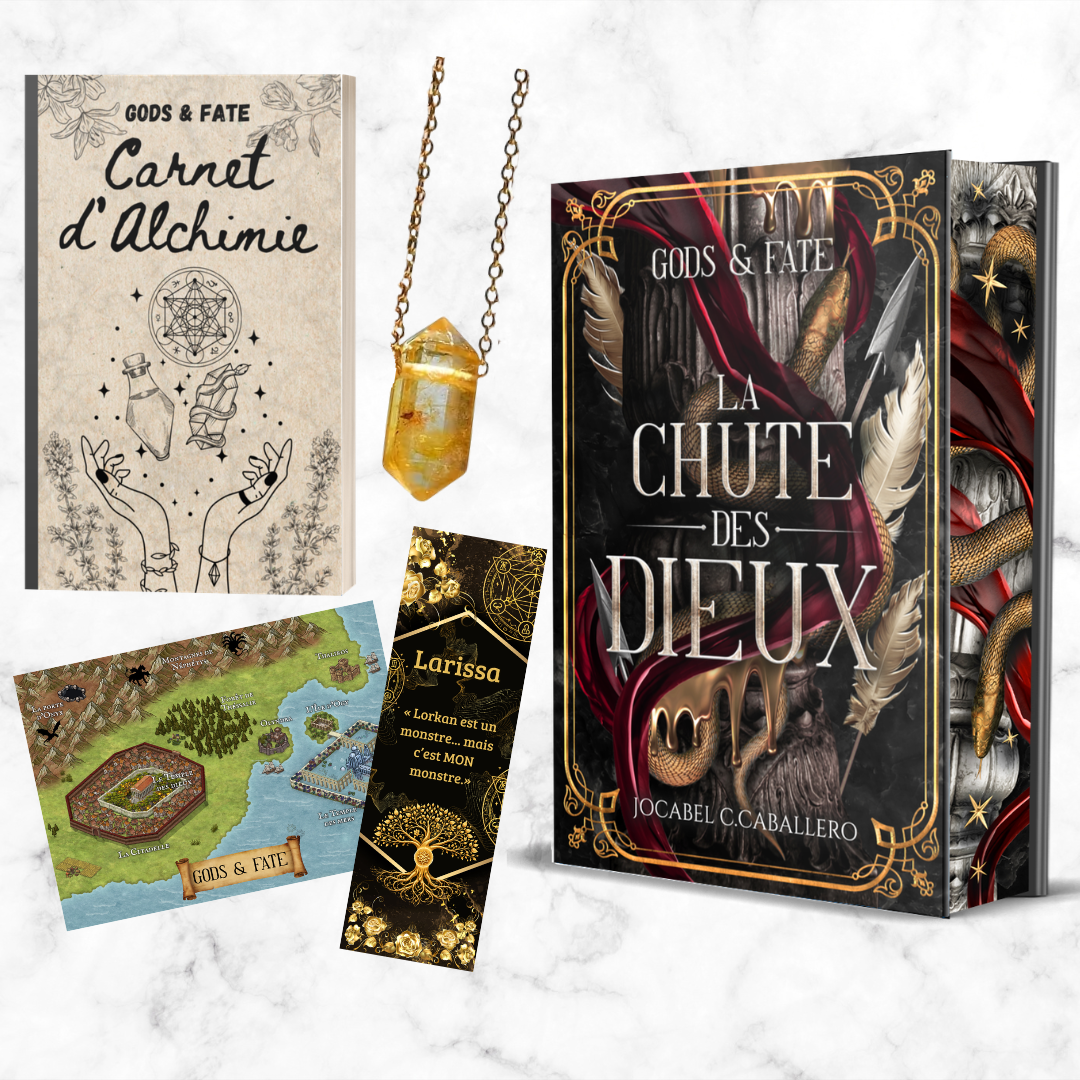 Replongez une dernière fois dans Gods & Fate avec l'édition collector du roman ! Vous y trouverez un jaspage somptueux, des dorures raffinées et des pages de gardes illustrées !
